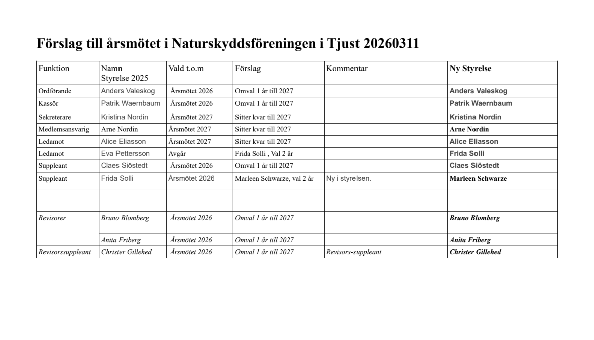 Styrelsen I Naturskyddsförening i Tjust består av 8 personer, varav 6 ordinarie och 2 suppleanter.